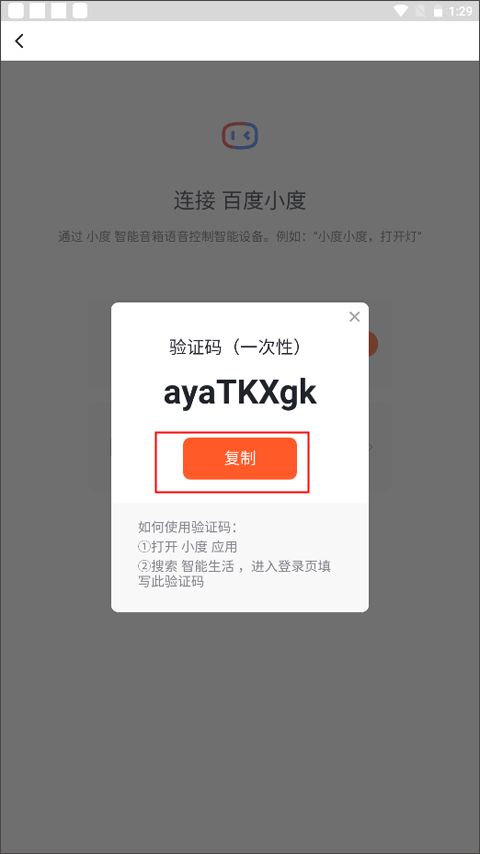 3、验证码连接方式将先将验证码复制并粘贴到文本框中,然后打开小度应用,搜索智能生活,进入登录页填写此验证码;而用账号密码连接只要跟着它给出的相关教程一步一步操作就可以了。