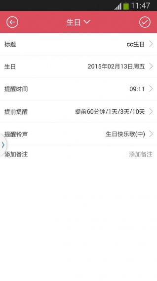 1、支持各种常用提醒,如:生日、节日、纪念日、起床闹钟、会议、还房贷、还信用卡、尾号限行等。