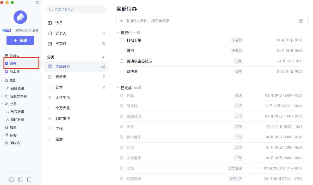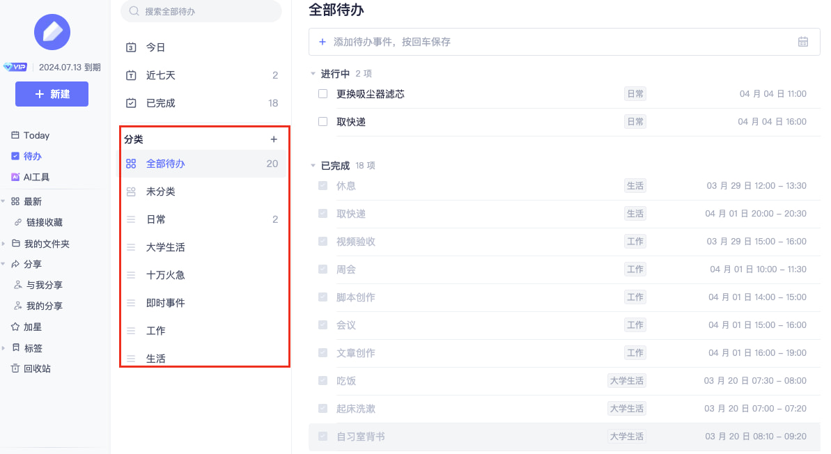 在待办中,「全部待办」和「未分类」两栏不支持随意拖动调整顺序;自建的待办分类,支持随意拖动修改顺序