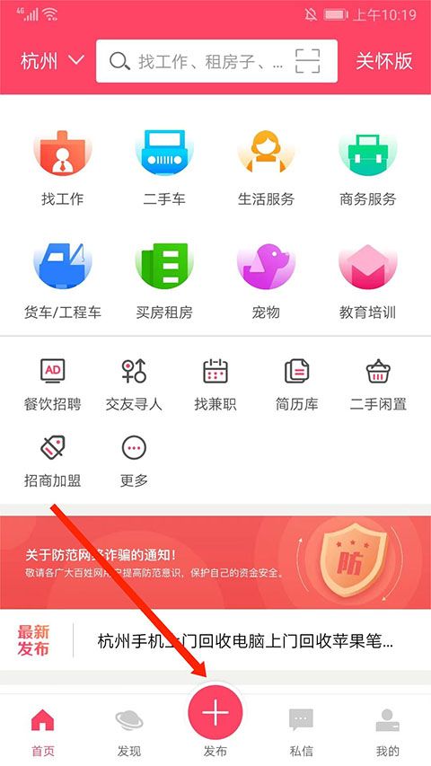 1、打开百姓网app官方最新版,选择下方“+号”图标。