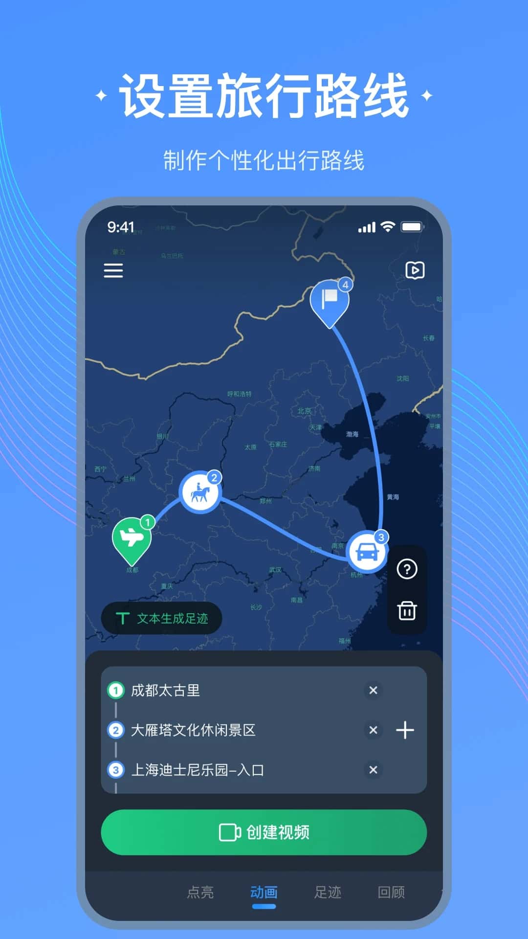 1、详细记录自己的旅行轨迹,快捷创建生成动画路线图。