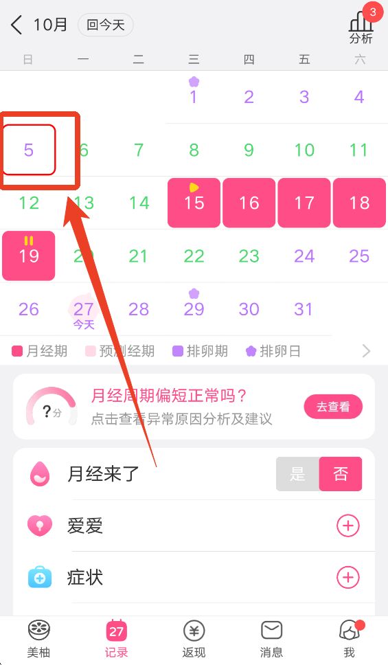 1)点击日历上正确的姨妈开始时间,如图上的5号。