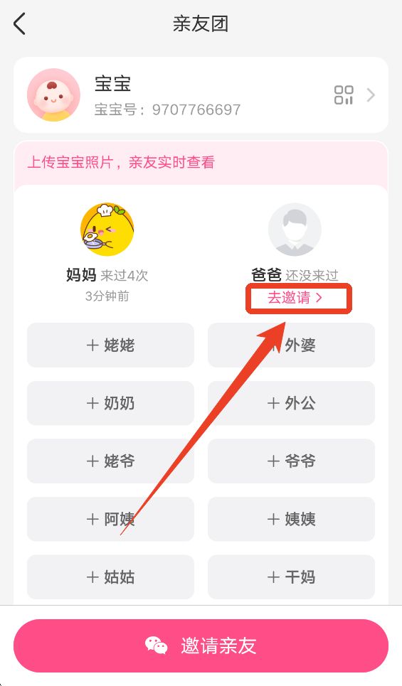 1、进入App首页,顶部栏选中宝宝,点击背景图上的「邀请亲友」进入亲友团。