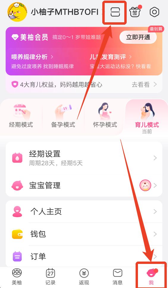 4、或者通过美柚App的扫码功能,扫描宝宝二维码关注宝宝 。