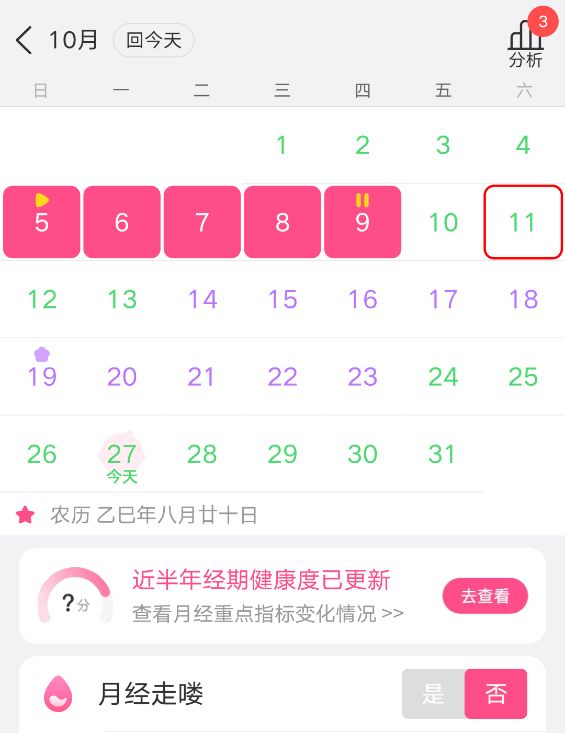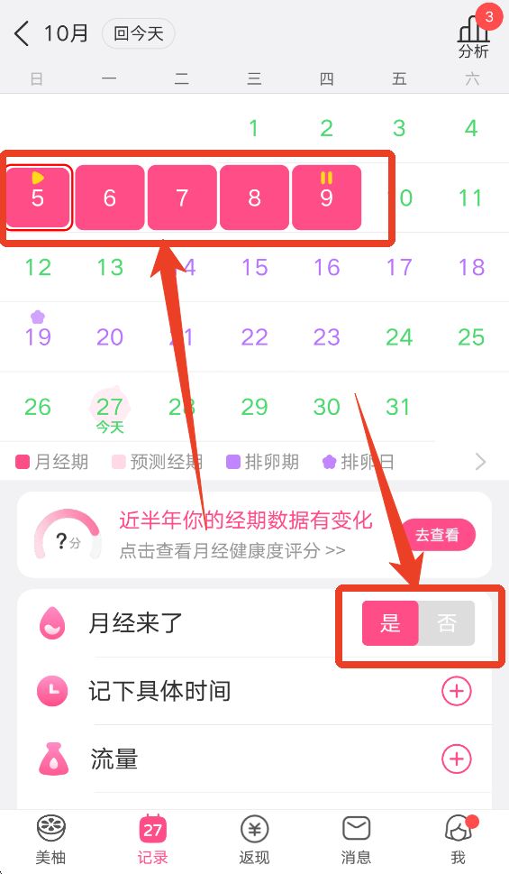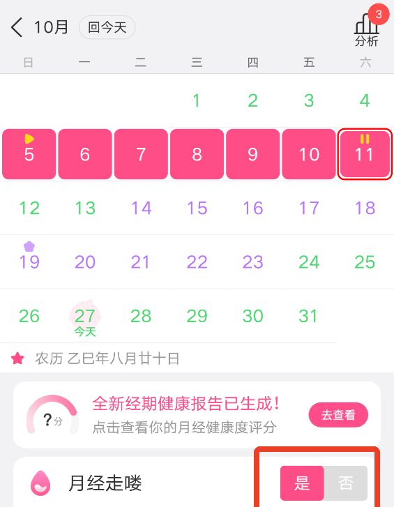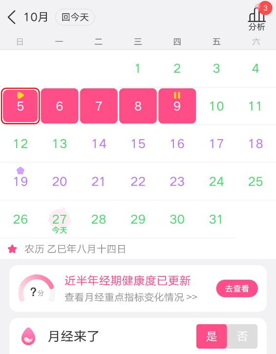2)将【大姨妈来了】选择为“是”,就会自动更新新的经期开始日,并进行智能计算。