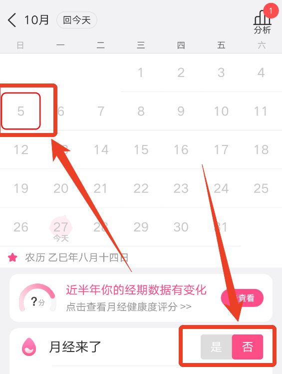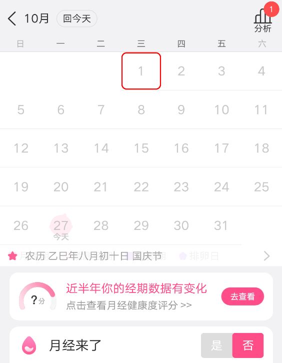 1)点击原来的经期开始日,如图上的1号,将【大姨妈来了】选择为“否”,清除此次大姨妈记录;
