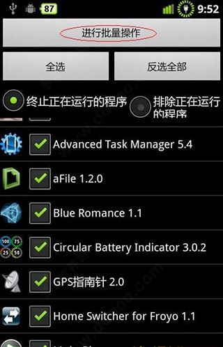 2、点击手机左下“菜单键”。便进入下载图。然后再点红圈内“批处理”。