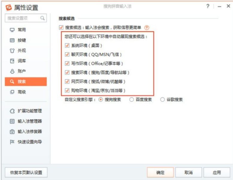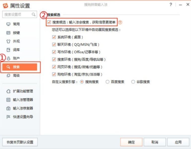 如果您希望开启或关闭搜索候选功能,按如下操作:打开输入法菜单-->属性设置-->搜索。 选择开启或关闭“搜索候选”即可。如果您取消了搜索候选功能勾选,输入法界面上将不再展现搜索候选下拉按钮,也将不响应↓方向键打开搜索候选结果。