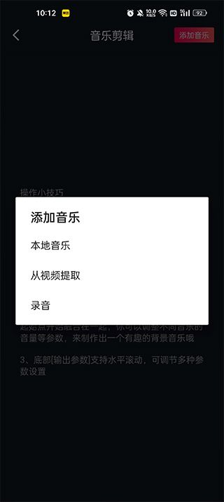 2、点击音乐剪辑进入,进入剪辑页面,点击右上角添加音乐, 可添加多个音乐;