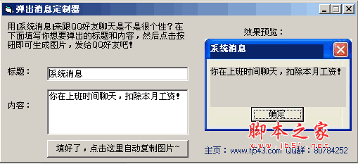 弹出消息定制器是一款生成聊天图片的工具,图片内容就是自已写的字。界面和Windows系统弹出的消息一样。适合用于QQ聊天娱乐。打开软件,填写标题栏和内容,点击按钮即可自动复制图片到剪贴版,在聊天窗口中粘贴即可使用