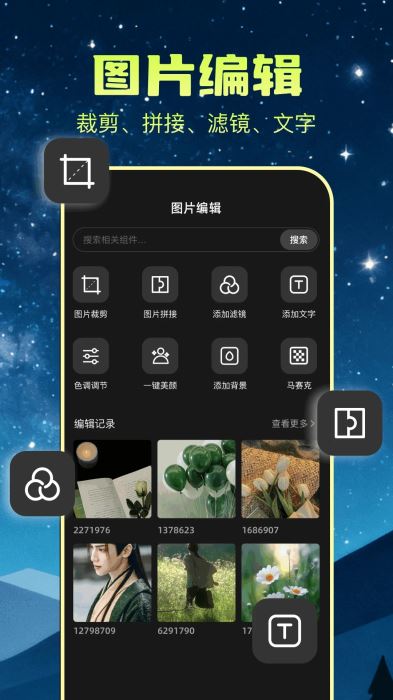 涵盖多类别壁纸,满足用户多样的壁纸需求。具备裁剪、拼接、添加滤镜、文字、色调调节、一键美颜、添加背景、马赛克等多种编辑功能,可满足用户对图片的各类编辑需求。