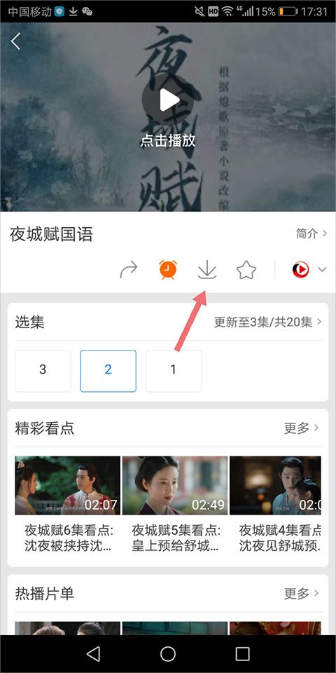 1、如果播放的视频提供了下载渠道,视频就可以在百度app内进行缓存下载,例如下载电视剧时,可以通过其播放画面下的下载按钮(下图红色箭头所指区域)点击进行视频缓存下载