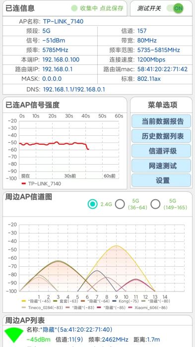 3.可WIFI性能测试:WIFI信号强度,信道,频段,带宽,频率,频率范围,监测WIFI断连情况,网速测试等。