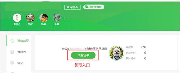 第一步:在班级毕业后,您进入班级首页,会有领取毕业证书入口,具体如下图: