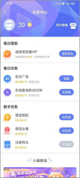 软件中提供了积分任务,根据观影时长、活跃度等操作可以获得积分,是一项长期回馈用户的福利项目。