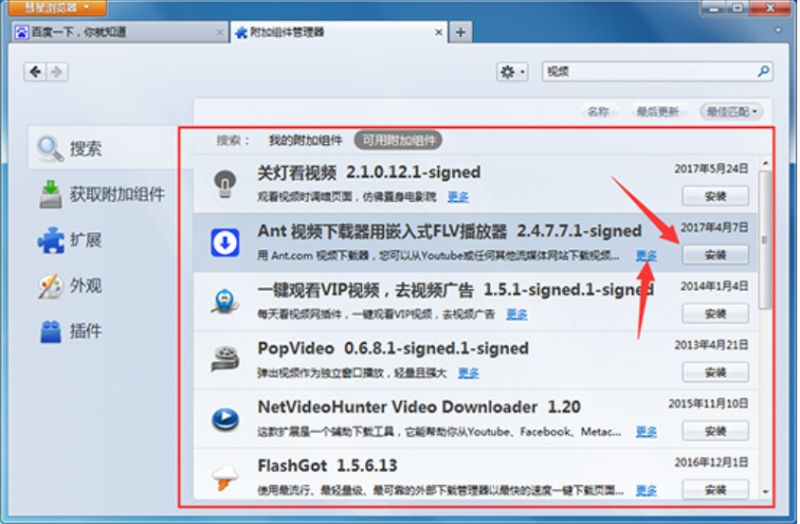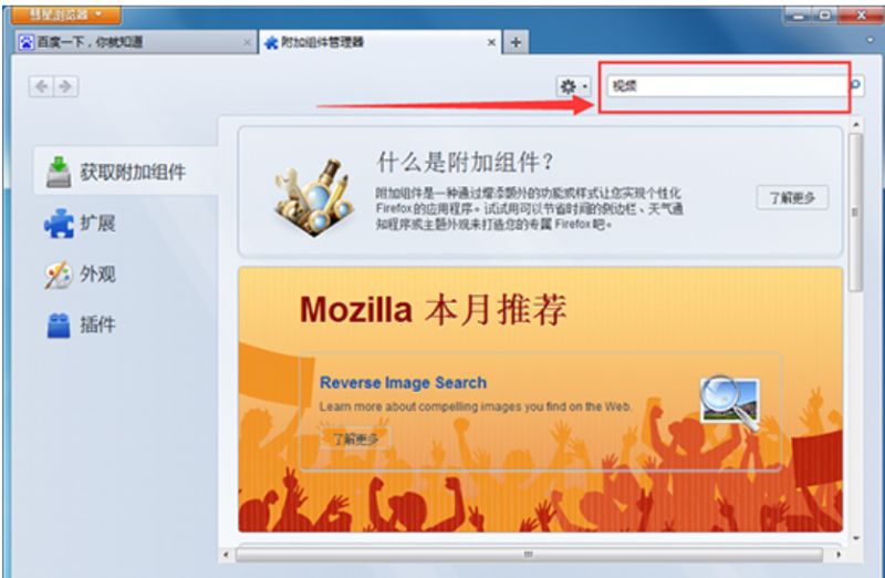 3、在附加插件界面的搜索框中搜索“视频、视频下载”等关键词,之后在搜索出来的结果中就可以看到各种下载网页视频的插件了;