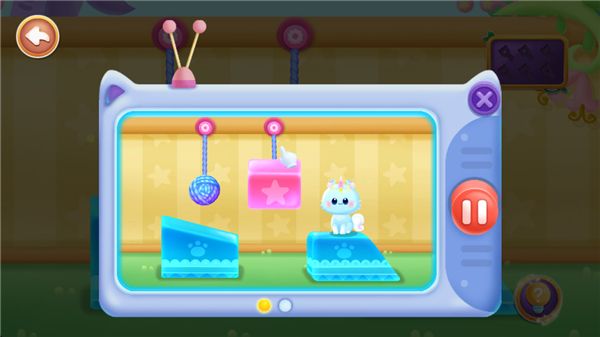 小猫吃饱喝足,宝宝陪它玩一会玩具吧!咦,毛线球玩具怎么不见了?原来小猫的毛线球被吊绳勾住了!宝宝拿起剪刀,剪断吊绳吧。砰咚!毛线球落地,小猫拿到心爱的玩具咯。