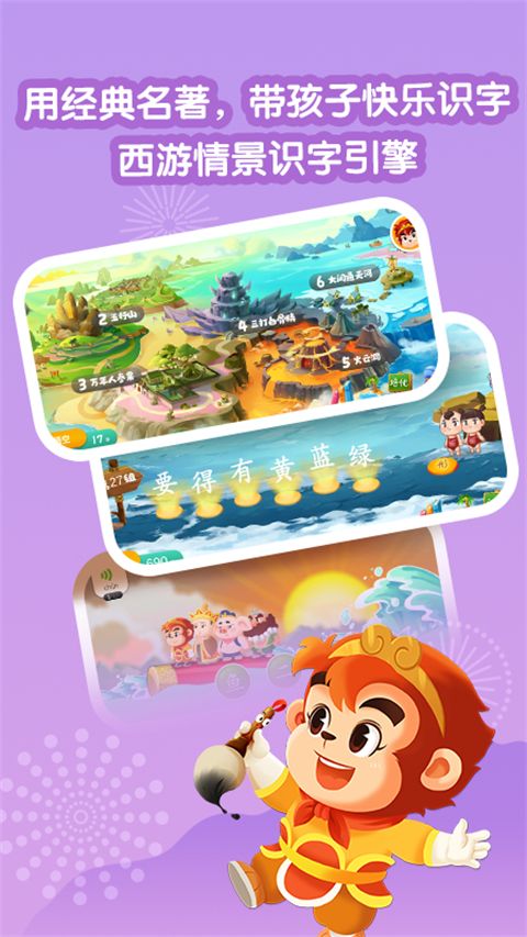 3、以孩子喜闻乐见的《西游记》为背景,15大西游故事关卡,边读名著边识汉字,孩子感兴趣。