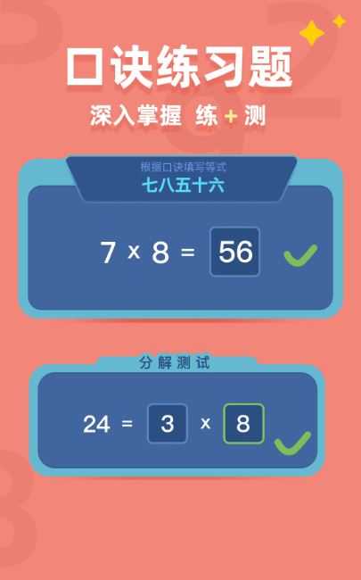 乘法口诀练习app是一款专为孩子设计的九九乘法表学习软件,助力让每个孩子都能通过自主训练提升自己的乘法口算能力,轻松和快速的掌握乘法知识,助力在日常练习和做作业中能更加高效的答题。