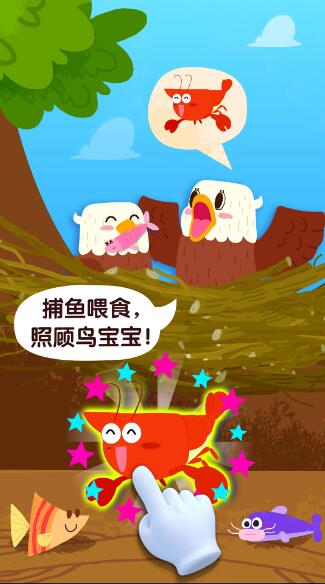3、快看,鸟宝宝破壳而出啦!宝宝快和小鸟们一起去寻找食物吧!与老鹰、天鹅一起在激流中捕鱼;与鹦鹉、巨嘴鸟共同在丛林中飞行,寻觅新鲜水果,为鸟宝宝们准备一顿美味大餐!哇!小鸟们带回来的食物好多呀,快根据鸟宝宝的要求,挑选食物喂饱它们,这样它们才有力气练习飞行呀!