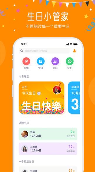 按照类型自定义分类,朋友、家人、同学、同事、客户生日一目了然。