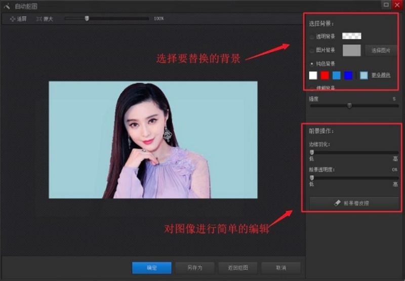 4、接下来替换图片背景,然后点击查看自己抠出来的图像。如果没有抠好或者不满意的话,可以点击返回抠图继续进行编辑。确认抠图完成可点击在右边的背景色来选择替换,这里有各种颜色可供选择也可以调取电脑存有的图片作为背景。在下方还可以对图像进行简单的前景操作,如边缘羽化、前景透明度等。