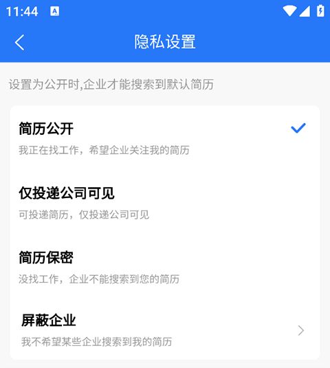 2、在隐私设置界面可以将建立设置为公开、仅投递公司可看等。