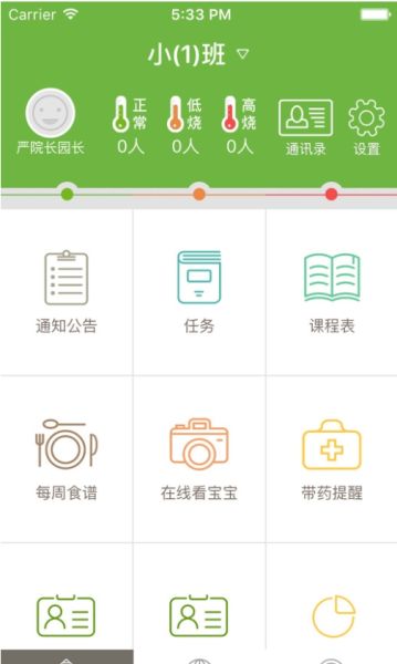通知公告、任务、课程表、每周食谱、在线看宝宝、带药提醒等。