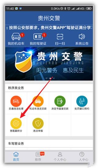 1、首先进入贵州交警123123处理违章app后,使用自己的注册帐号登录,点击页面中的“答题赢积分”项。