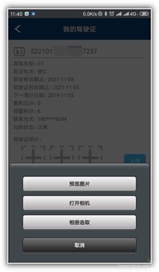 4、然后在弹出的悬浮菜单中,选择其中的一种添加照片的方式,如打开相机现照,或者相册选取已经照好的驾驶证照片。
