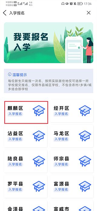 1、打开曲靖通手机客户端,在首页中点击入学报名。