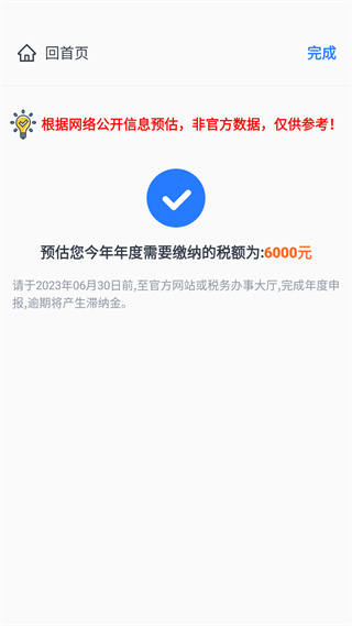 计算完成之后,会显示个税助理App预估您今年年度需要纳税的税额,以帮助您做出判断和制定税务计划。