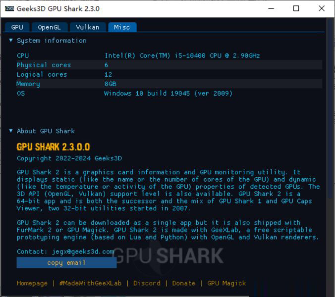 1、说起显卡信息识别与状态监视工具,我们最熟悉也是最常用的当属GPU-Z,除了GPU-Z外,还有不少轻量级软件,来自Geeks3D网站的GPU Shark就是一款轻量级的显卡监测软件。