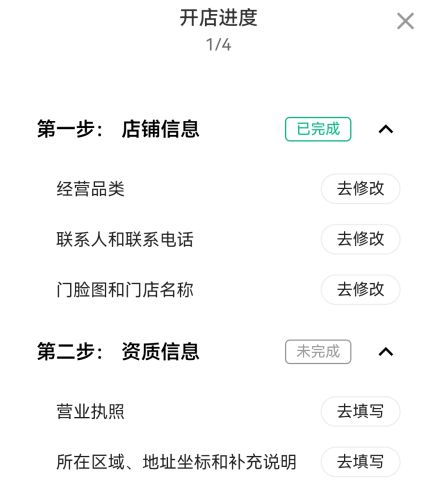 9、大家可以点击下方的【开店进度】可以查看后续的所有步骤,跟随指引填写全部信息完成后就能进入审核阶段,三个工作日会出审核结果(周六周日及节假日顺延)。