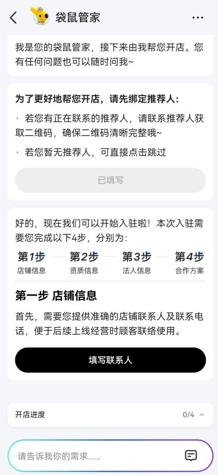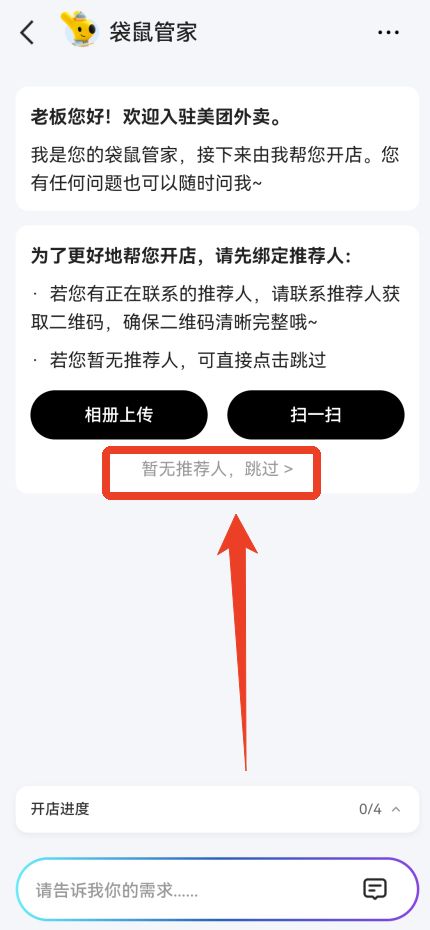 7、之后会跳转到袋鼠管家,会指引各位申请店铺,这个推荐人可以选择跳过。大家在申请过程中有什么不懂的可以直接问袋鼠管家。