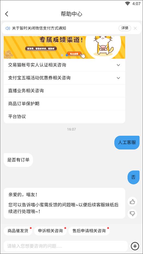 亲亲,目前仅有安卓版APP可使用微信支付抚养费选客服功能,其他端口暂时未开放。
