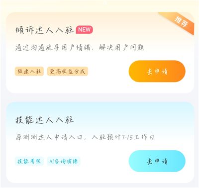 1、首页有倾诉达人入驻、技能达人入驻两个入口,选择想入驻的达人入口,点击【去申请】。