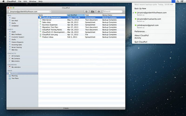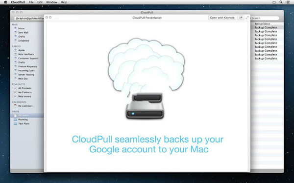 CloudPull for mac是一款可以在苹果电脑MAC OS X平台上使用的帮助用户备份数据的Mac软件,CloudPull for mac可以无缝备份您的Google帐户,CloudPull for mac支持Gmail,谷歌联系人,谷歌日历,谷歌驱动器。需要此款工具的朋友们可以前来下载使用。