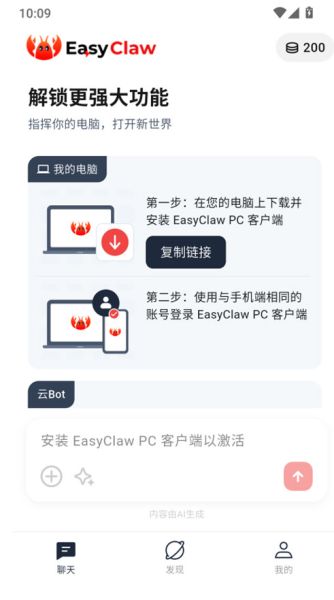2、登录以后,我们可以按照提示,在自己的电脑设备上安装EasyClaw PC客户端,然后登录与手机版同一个账号,即可实现远程下达指令;