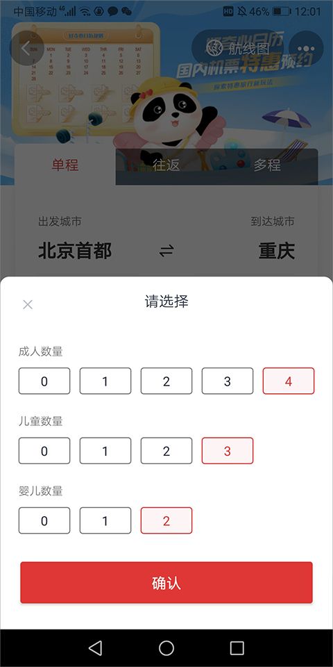 1、用户在机票预订时可以通过点击舱位数量进行设置,最多可以选择4个成人,3个儿童、2个婴儿。
