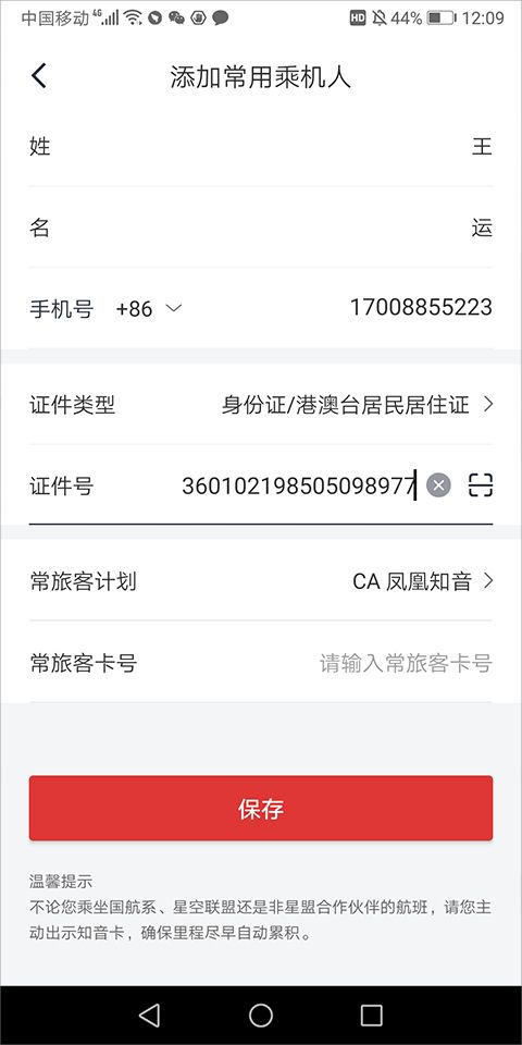 中国国航app如何添加同行人?