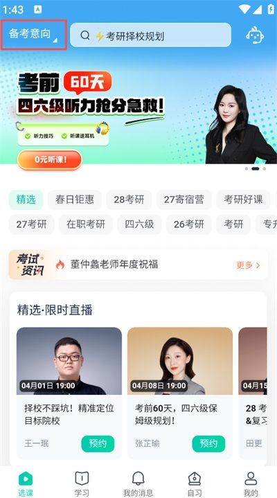 1、与老师、同学实时互动,支持回放缓存,覆盖考研、四六级、雅思等30余类考试。