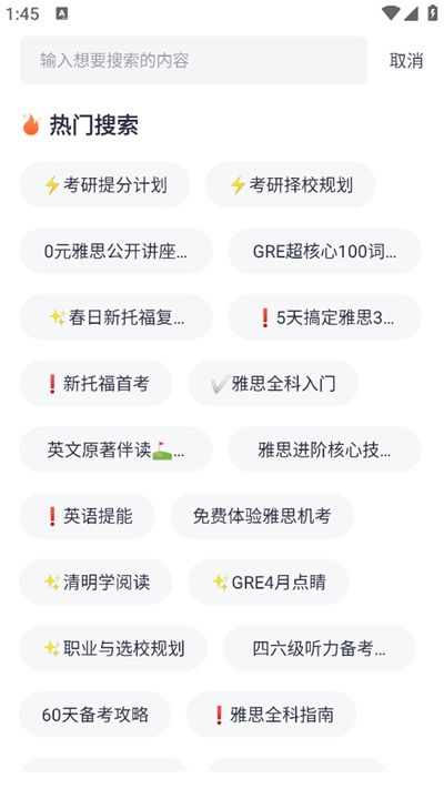 进入首页后,可以通过搜索框输入课程名称,比如考研、四六级、雅思、托福、教师 资格证等。