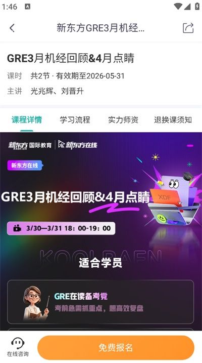 点进课程详情页,可以查看课程介绍、课时安排和价格,确认后点击报名或购买。