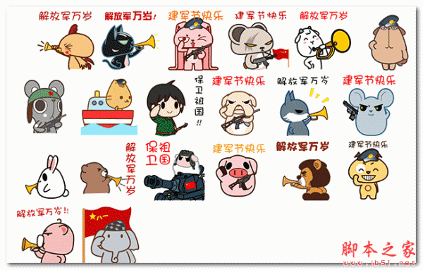 “八一”建军节即将到来,为了庆祝“八一”建军节,小编特地找到了一些关于建军节的动漫建军节专题QQ表情包,该QQ表情包中包含了黑眼鼠-建军节,黑眼狗-建军节,村村羊-建军节等几十张“八一”建军节QQ表情,喜欢的朋友可以过来带走。