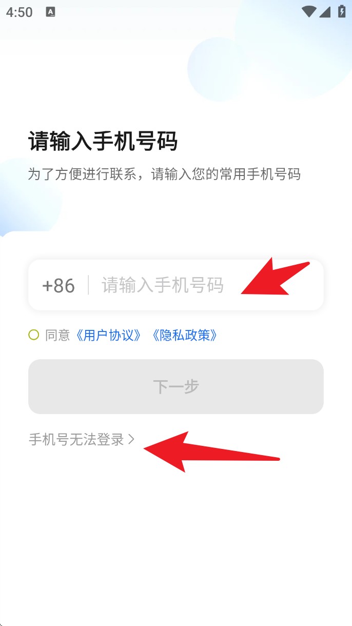1. 打开 App 后,您将进入登录界面。请在“请输入手机号码”字段输入您的手机号码,点击“下一步”继续登录。