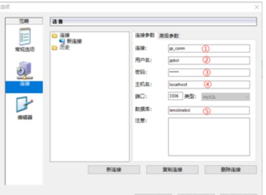连接:自定义名称;用户名:jpbsl;密码:jpbsl; 主机名:本机数据库为 localhost;数据库:lenslinebsl.