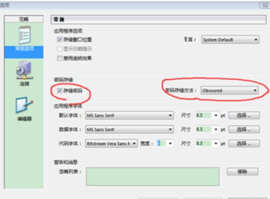 点击应用,保存成功。点击“常规选项”:勾选复选框“存储密码”,存储方法为Obscured。点击应用,进行保存。