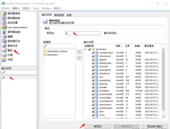 单击“备份”菜单,选择备份项目“jp”,右侧显示下图界面,点击“新项目”,输入项目名称,勾选备份数据库名,添加到右侧,对备份的数据表进行勾选(默认是全选)。