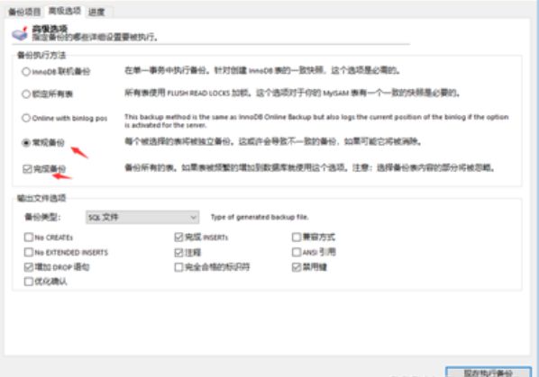 切换到高级选项,按下图勾选,选择“常规备份”,勾选“完全备份”: